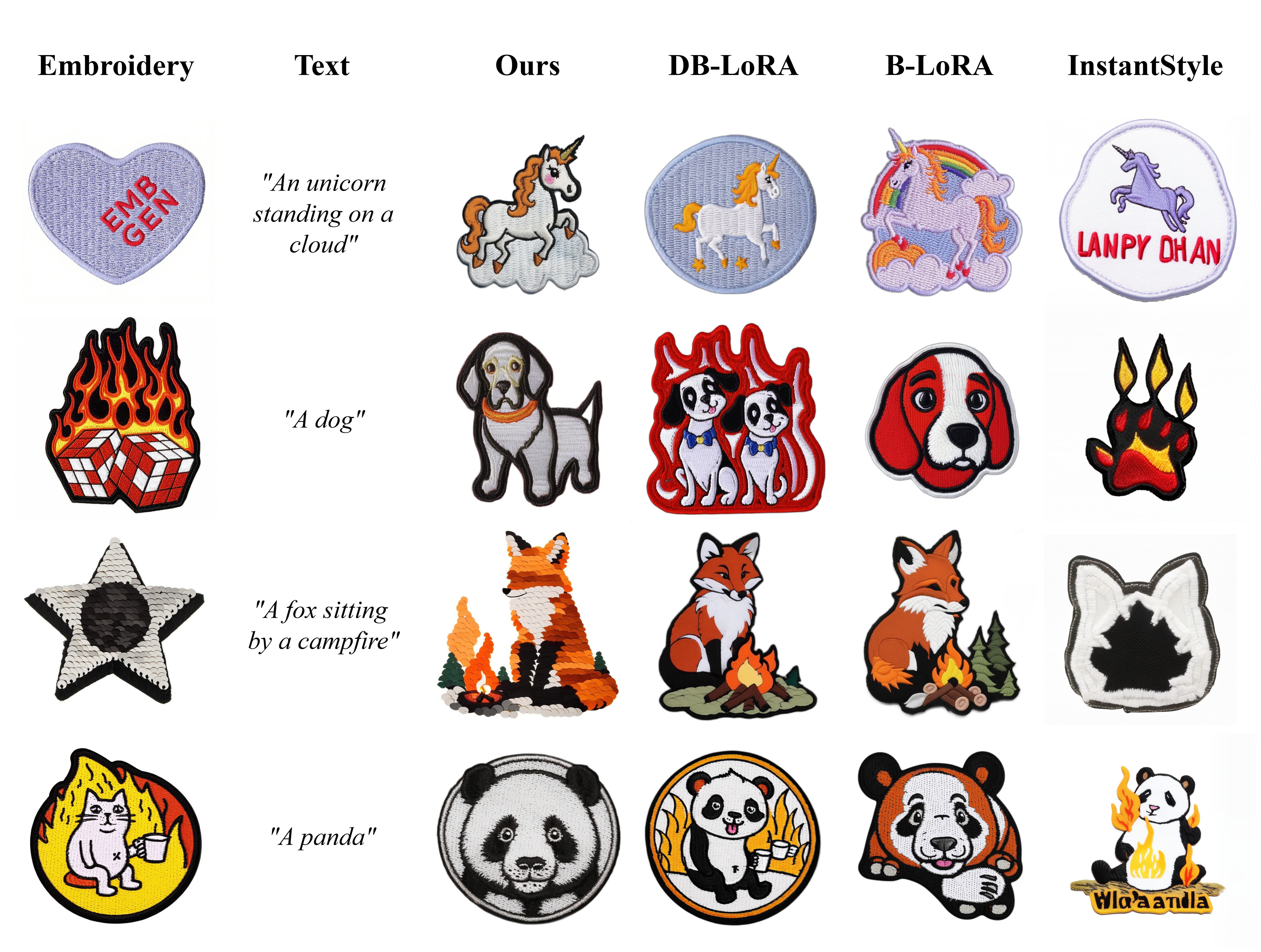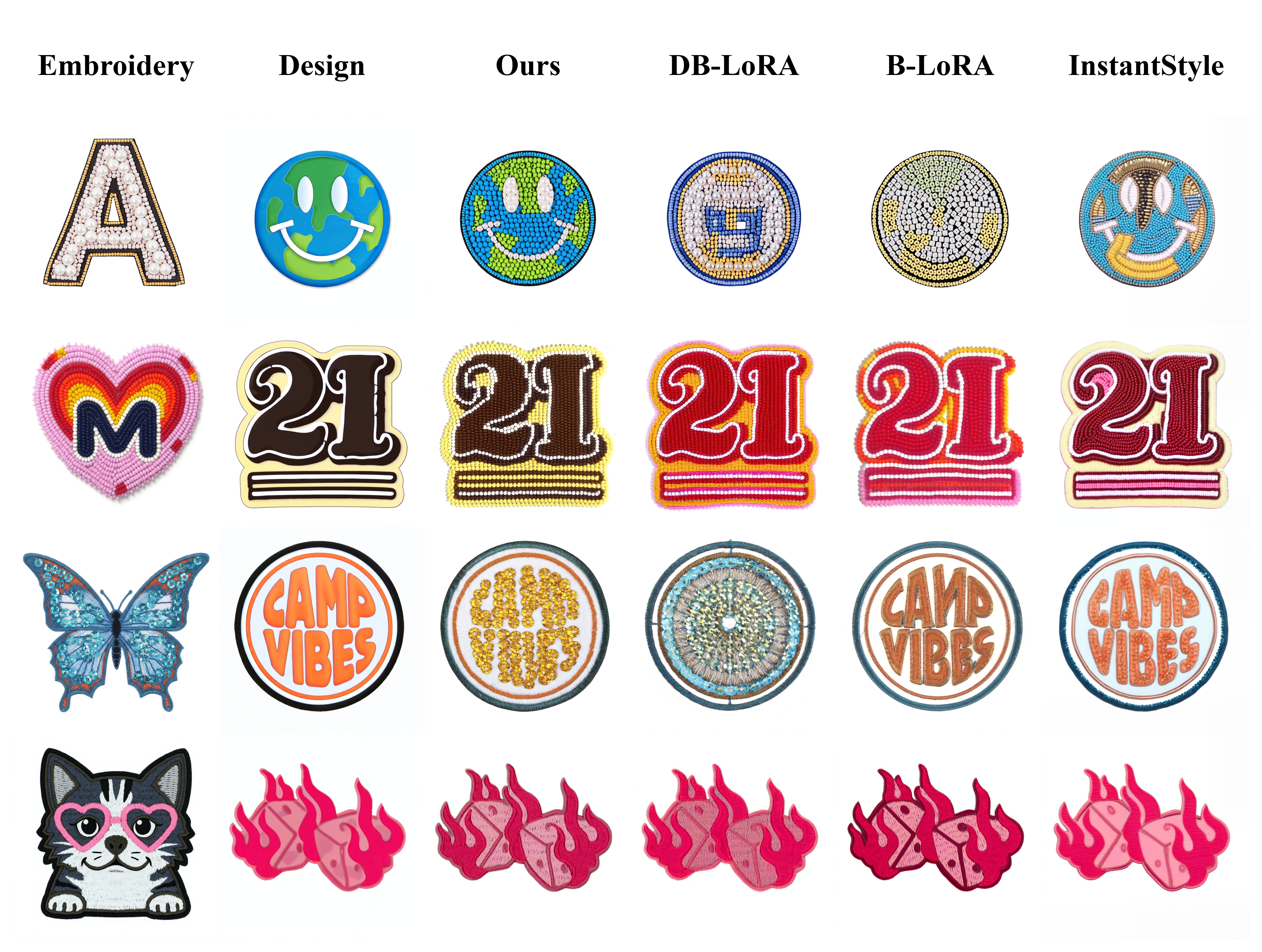 We propose EmoLoRA, a two-stage contrastive LoRA learning framework for fine-grained style customization from a single reference embroidery image.