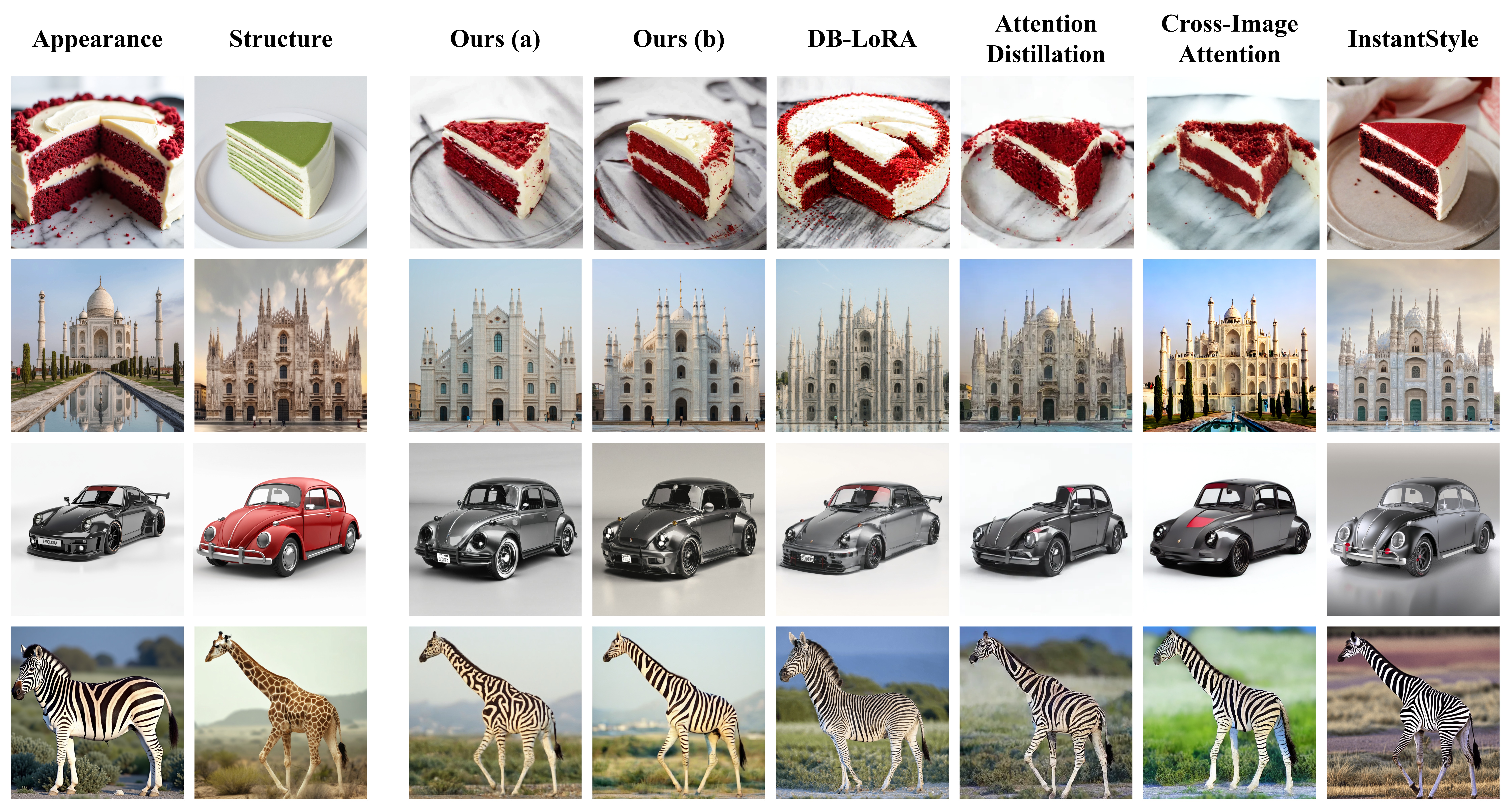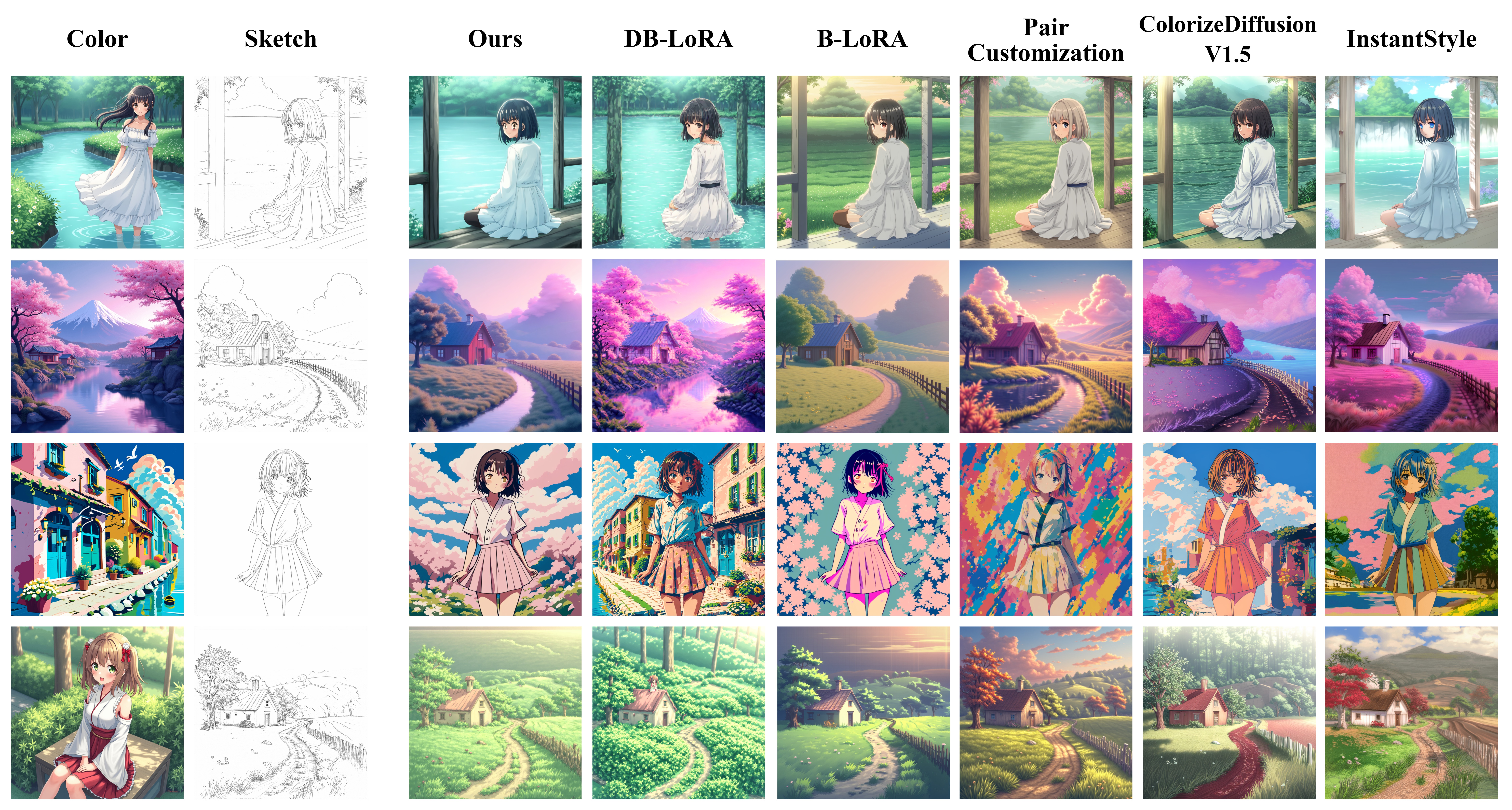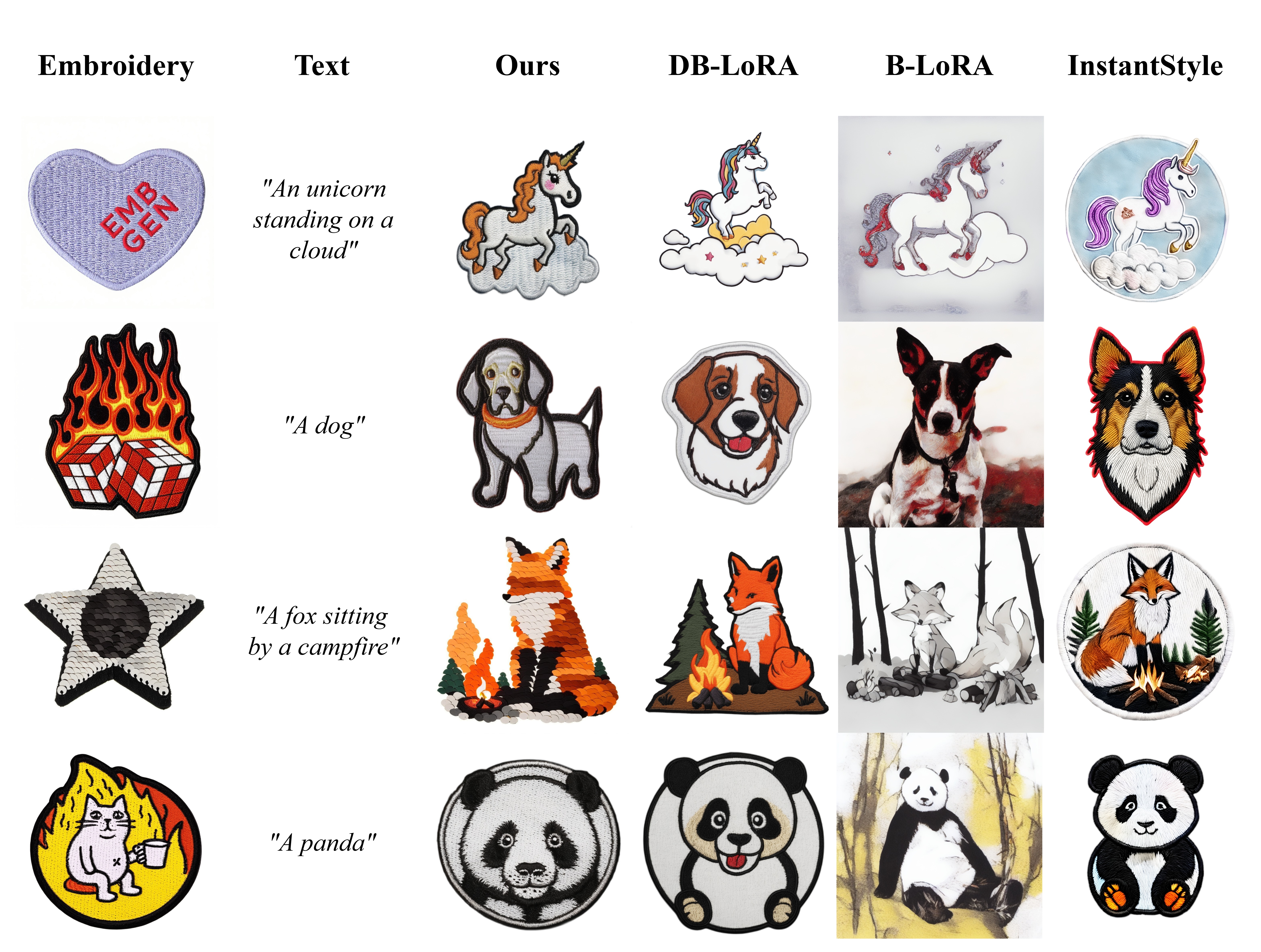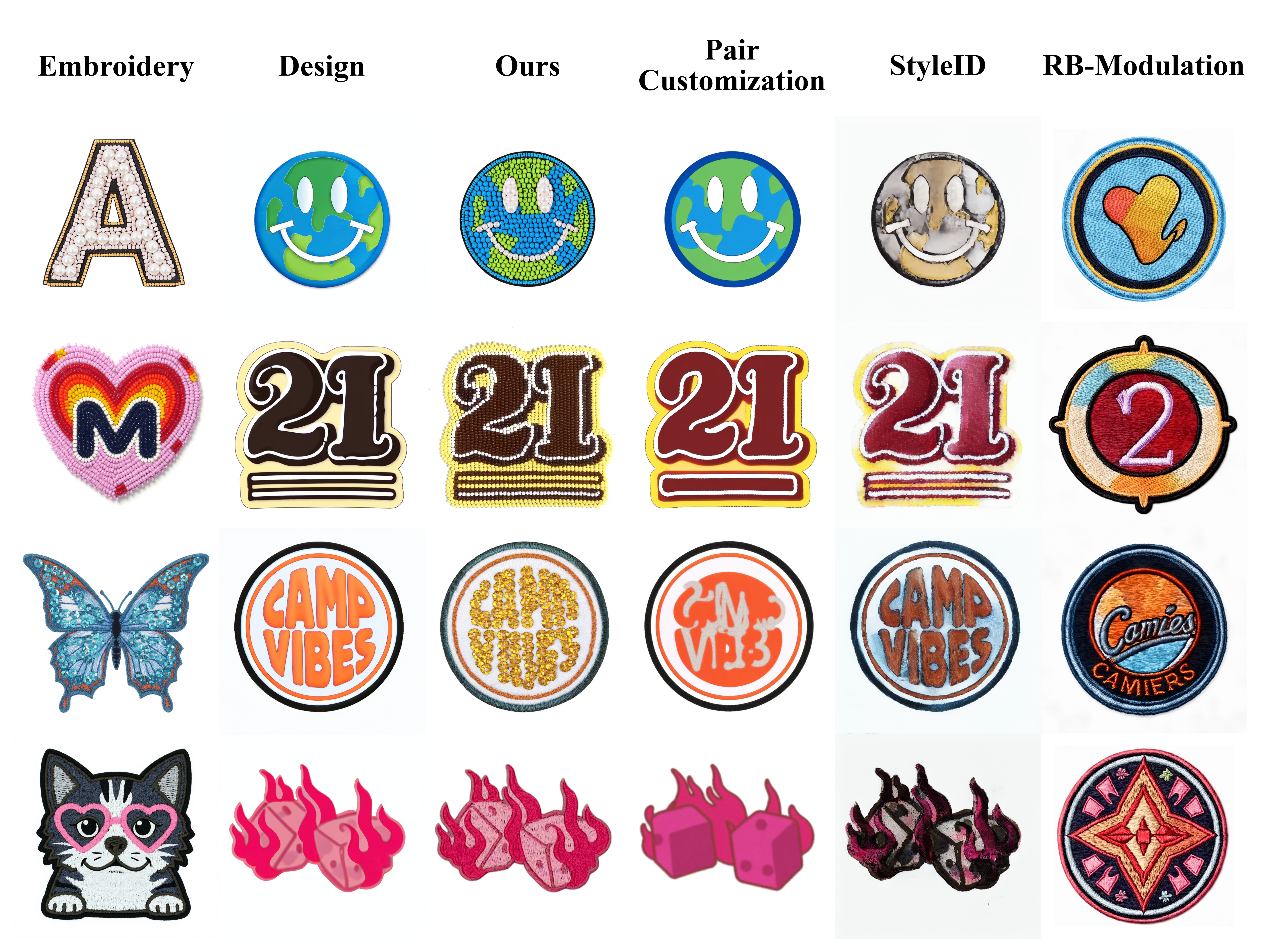To evaluate our method on fine-grained style transfer, we build a benchmark for embroidery customization. Our approach surpasses prior methods on this task and further demonstrates strong generalization to three additional domains: artistic style transfer, sketch colorization, and appearance transfer.