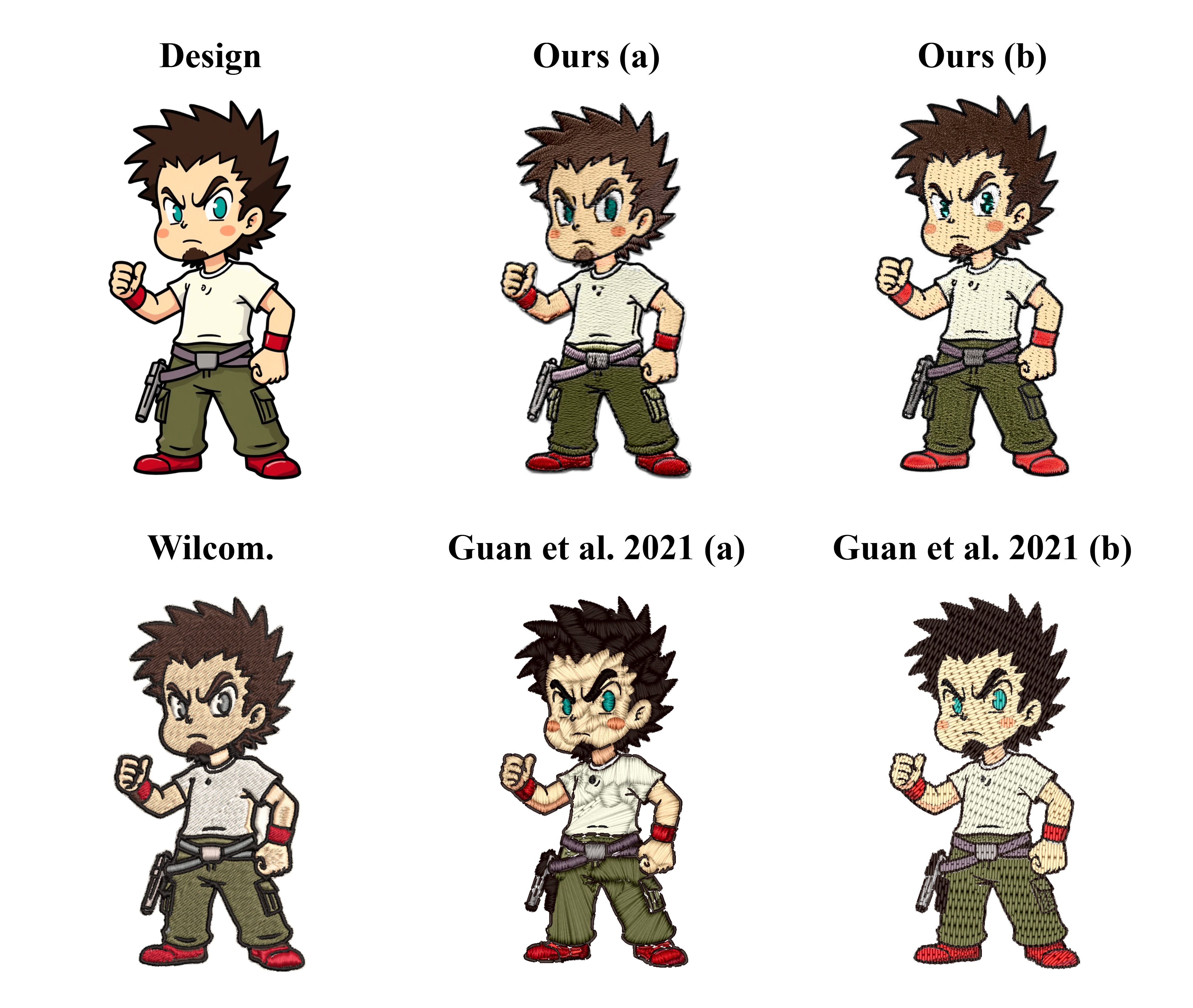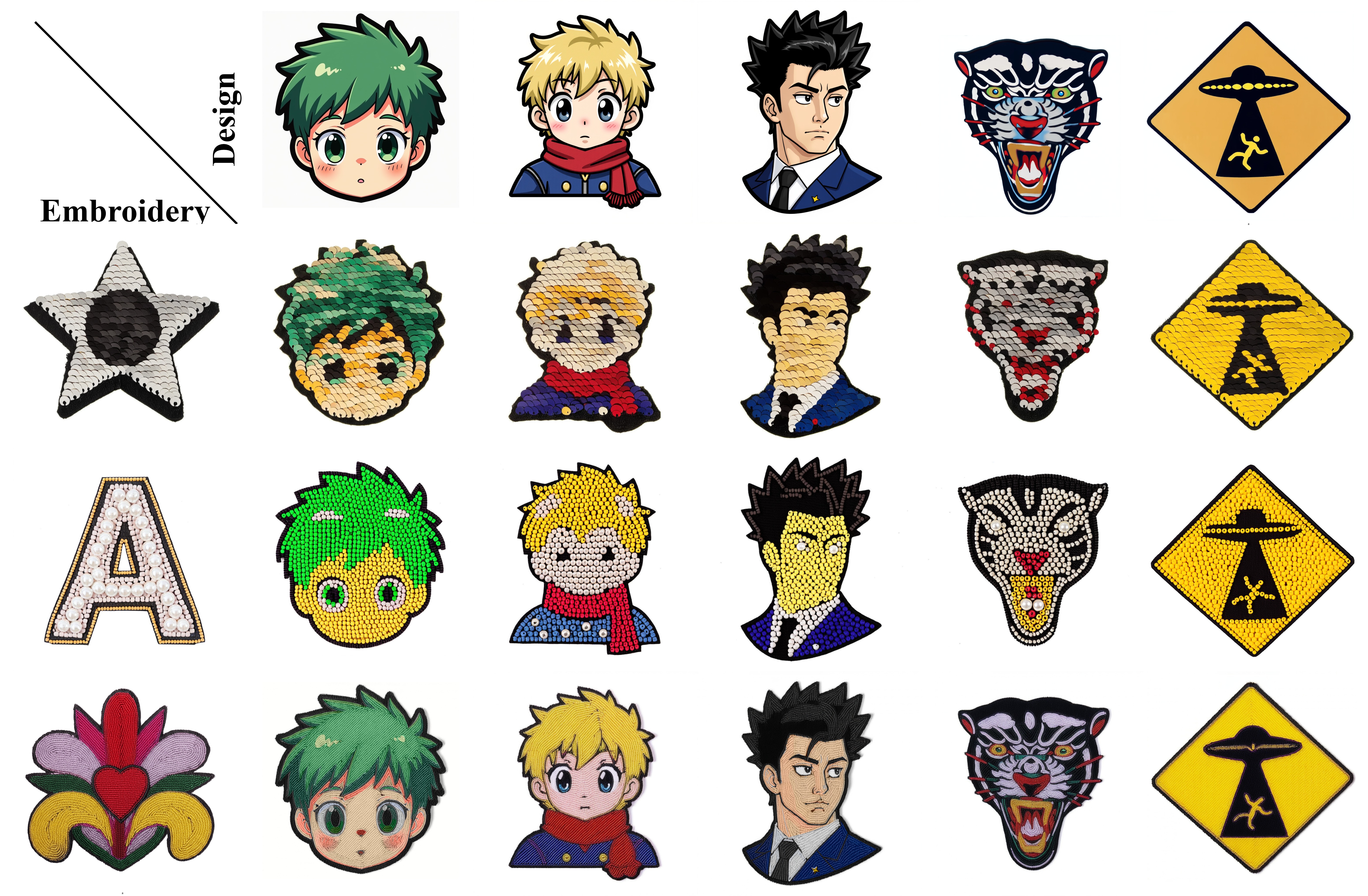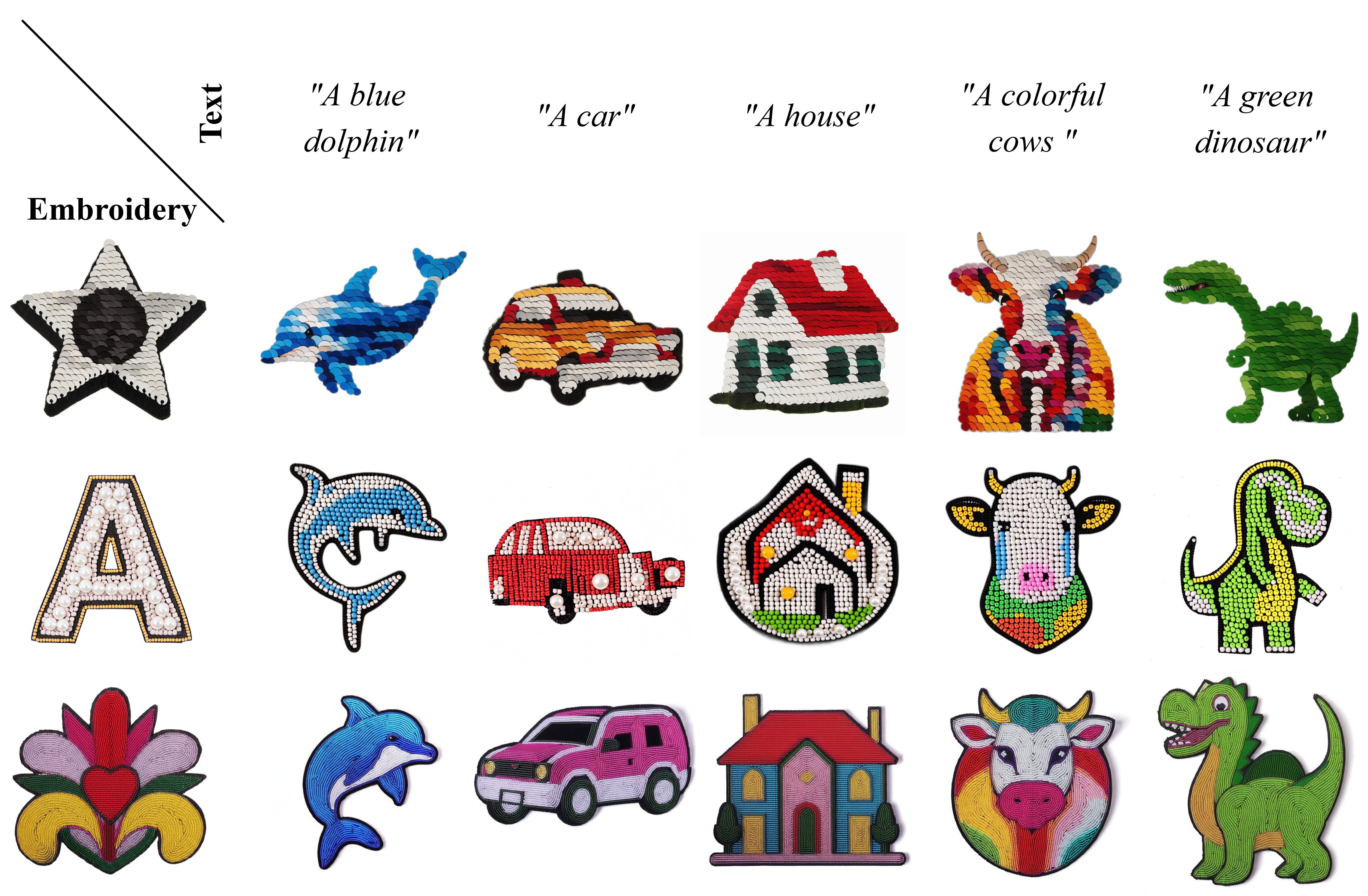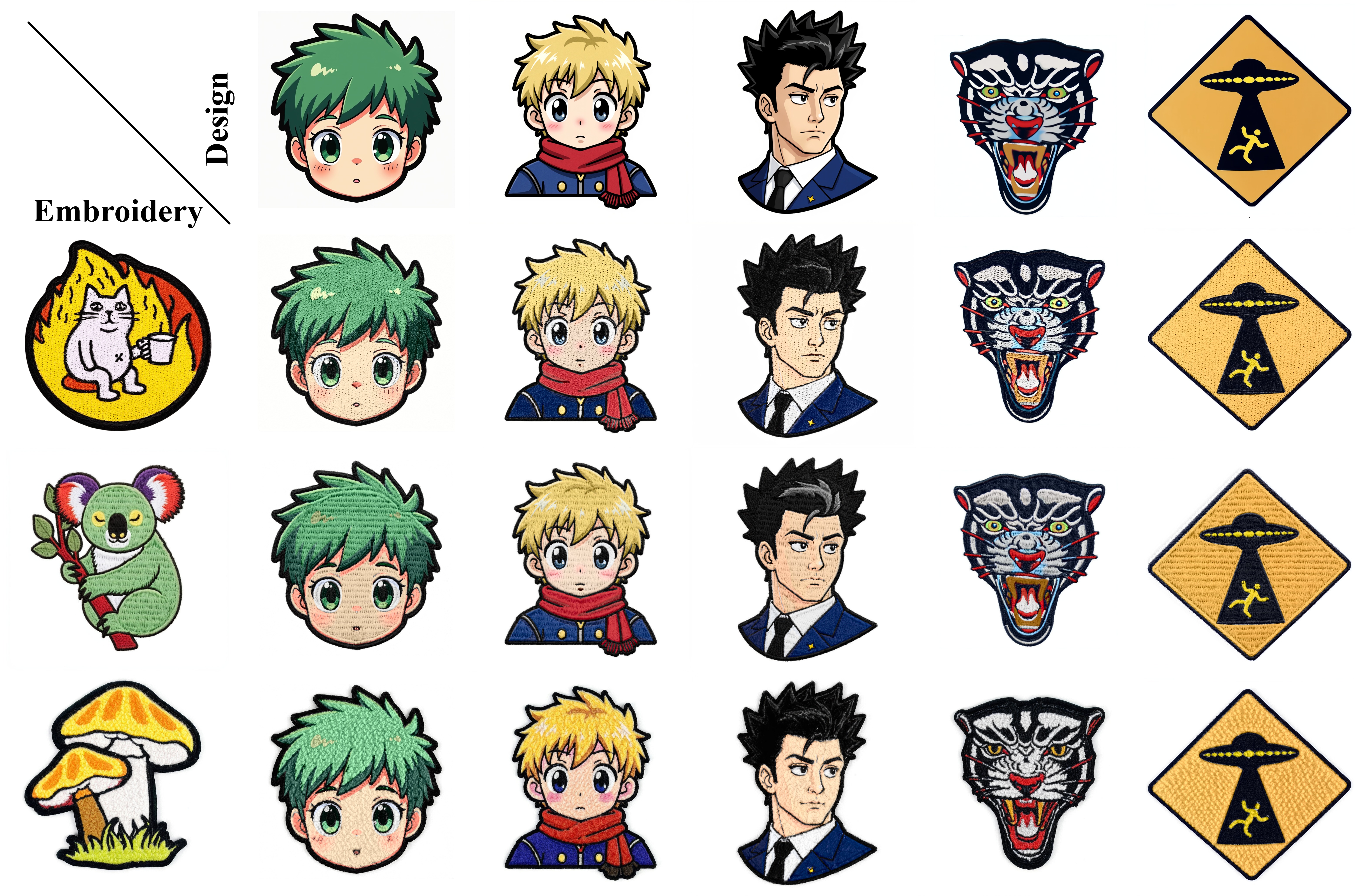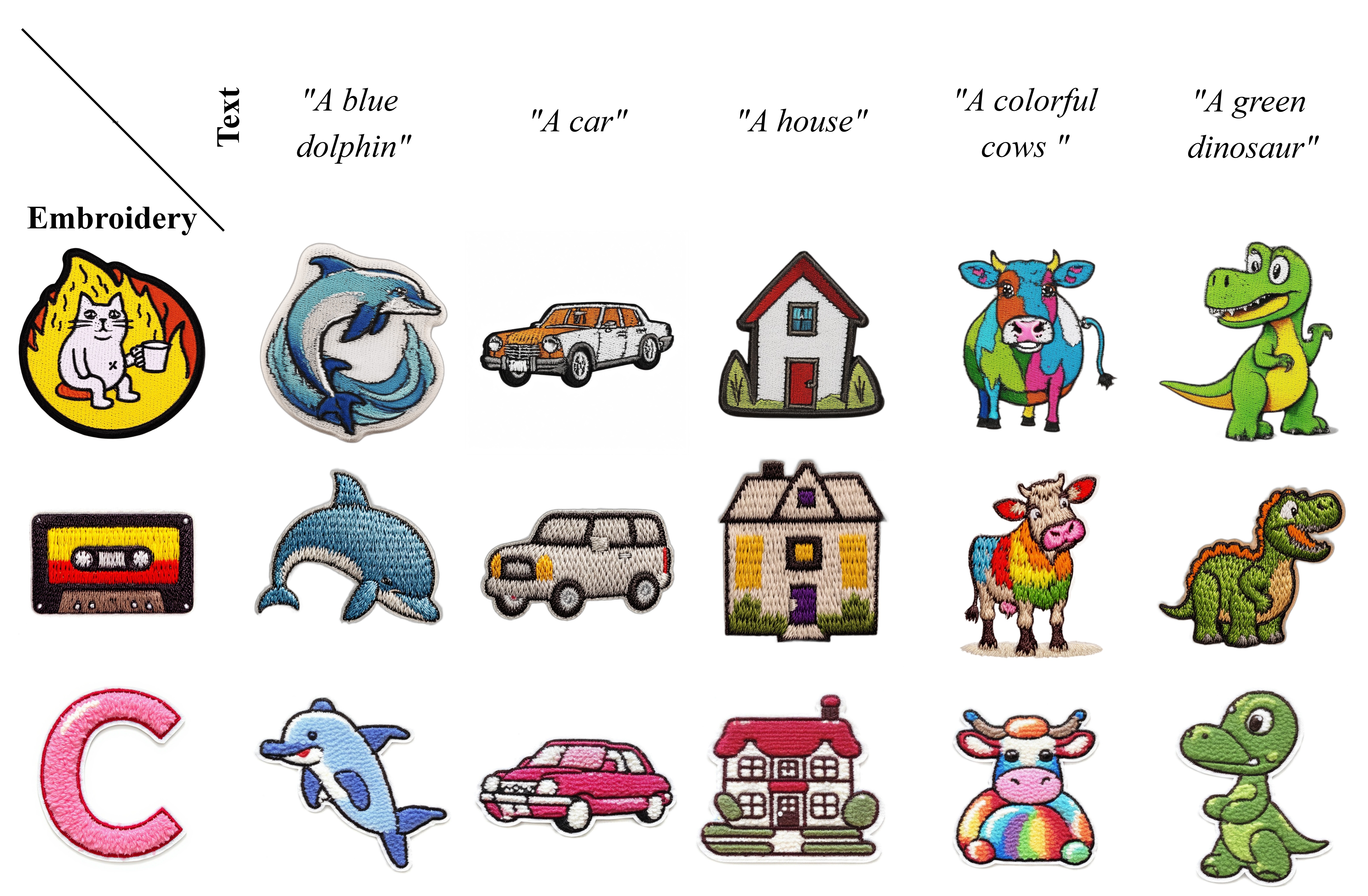 We showcase image-based generation and text-based generation results. For image inputs, EmoLoRA faithfully preserves design layouts while transferring embroidery style. For text inputs, our method produces realistic embroideries that follow prompts and maintain style–content decoupling.