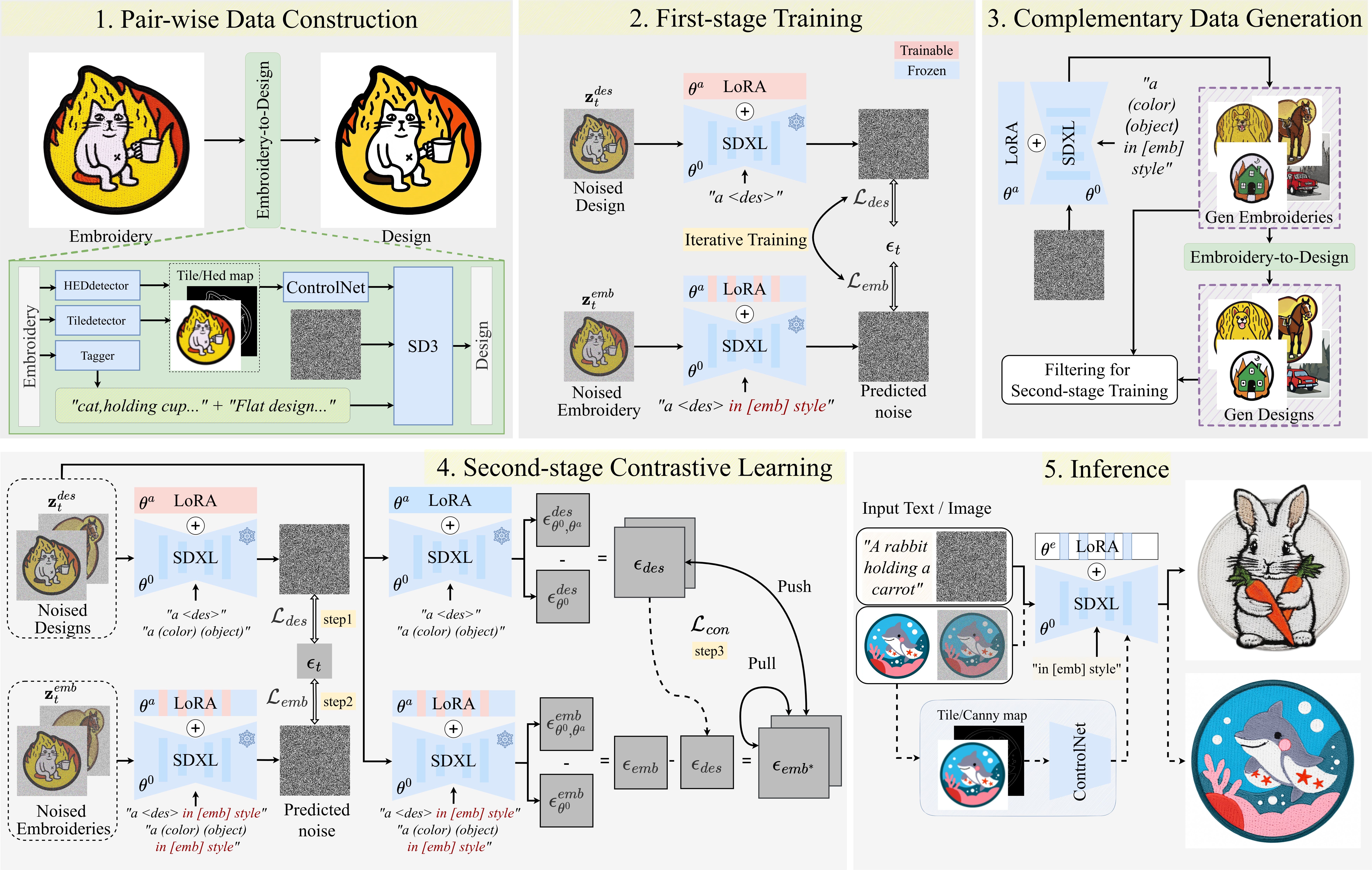 1. Pair-wise data construction: We convert the reference embroidery into a clean graphic design using ControlNet (HED + Tile) and caption prompts, forming embroidery–design pairs that define style/content separation.