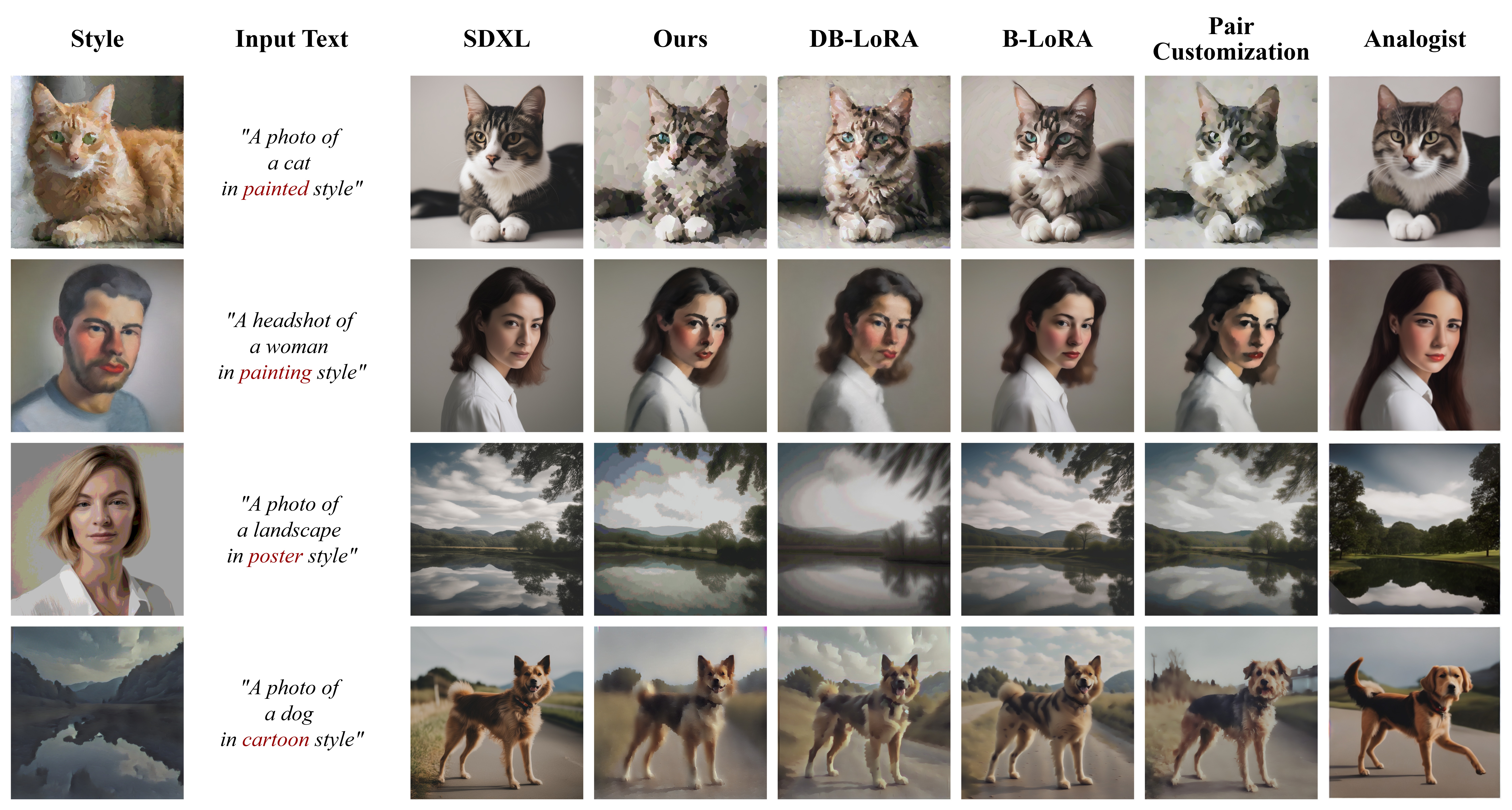 5. Inference: During image-based generation or text-based generation, only the style blocks are applied to SDXL, optionally with ControlNets and color correction, enabling faithful content preservation with precise style transfer.